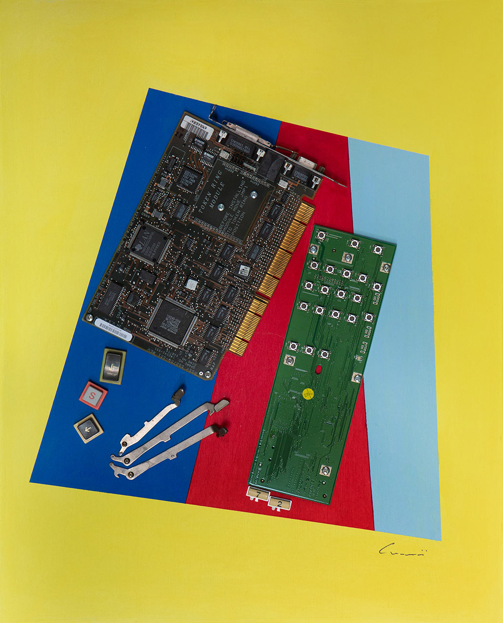 Opera costruita con martelletti, schede,tasti multifunzione, tasti calcolatrice e scheda rete.