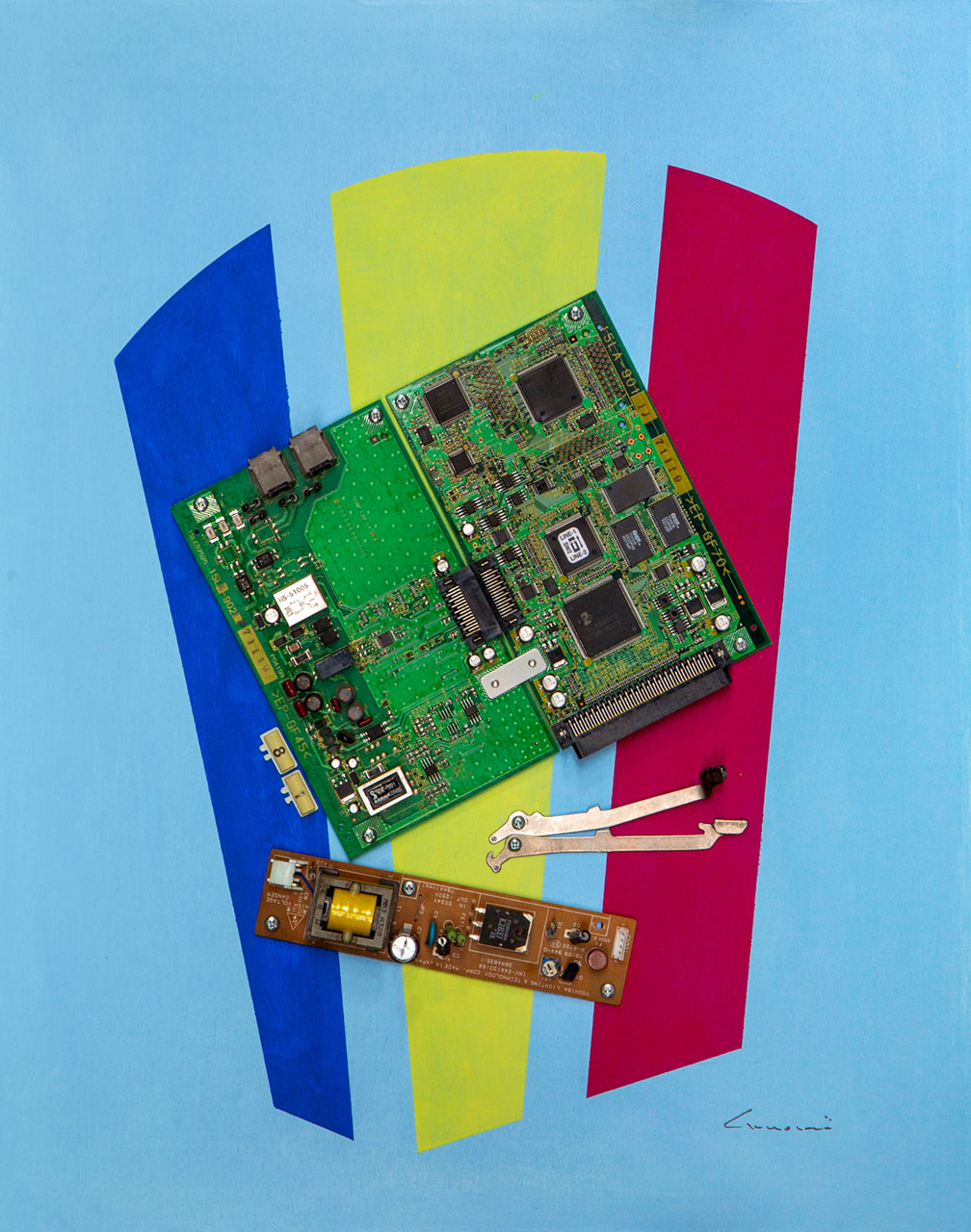 Opera costruita con martelletti, scheda rete e induttore multifunzione.Tavoletta di compensato 50×40 cm.