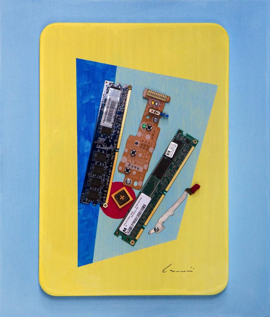 Opera costruita con martelletto, schede multifunzione e tasto calcolatrice.Tavoletta di compensato 50×40 cm.