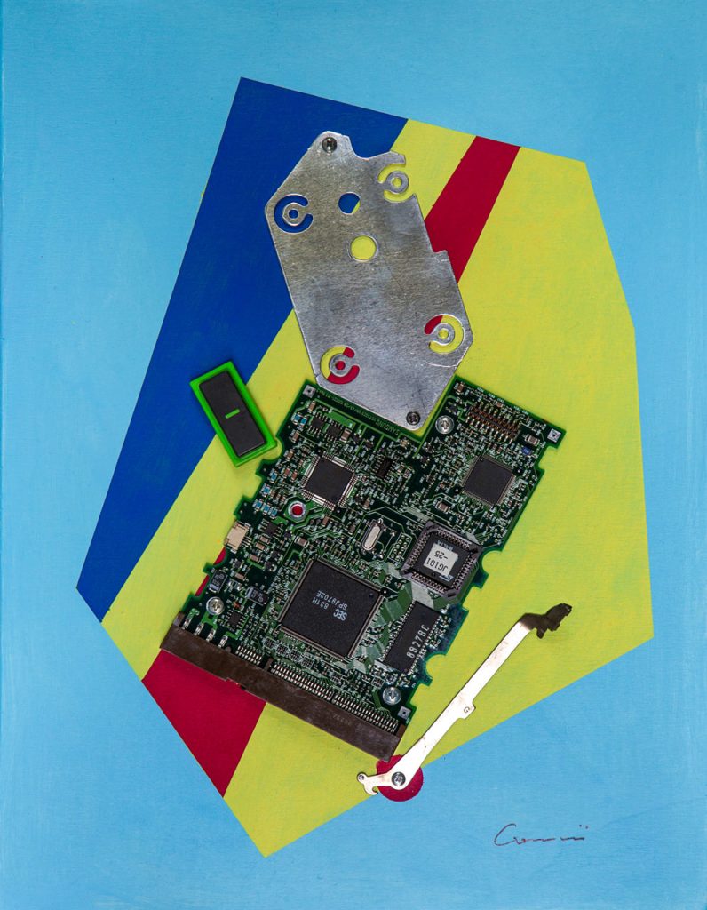 Opera costruita con martelletto, tasto calcolatrice, scheda e parte metallica.Tavoletta di compensato 35×26 cm.