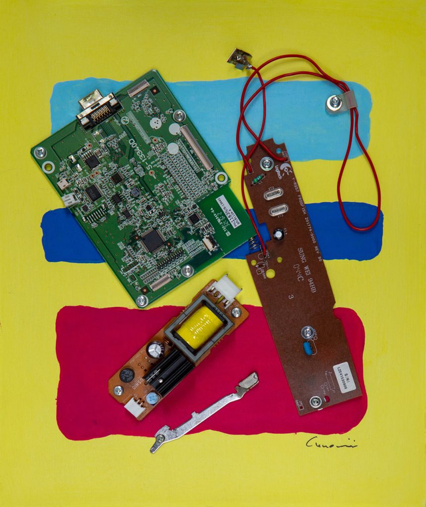 Opera costruita con martelletto, schede e induttore multifunzione.Tavoletta di compensato 30×25 cm.